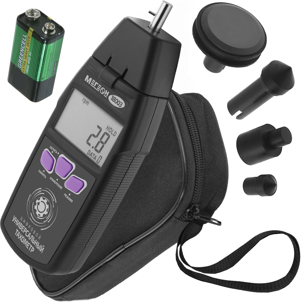 Комбинированный тахометр - это компактный прибор, предназначенный для измерения количества оборотов в минуту на расстоянии от 50 до 500 мм. Измерение осуществляется как бесконтактным, так и контактным способом. Выбор диапазона происходит автоматически. Устройство работает от батарейки 9В тип 6F22 (Крона).