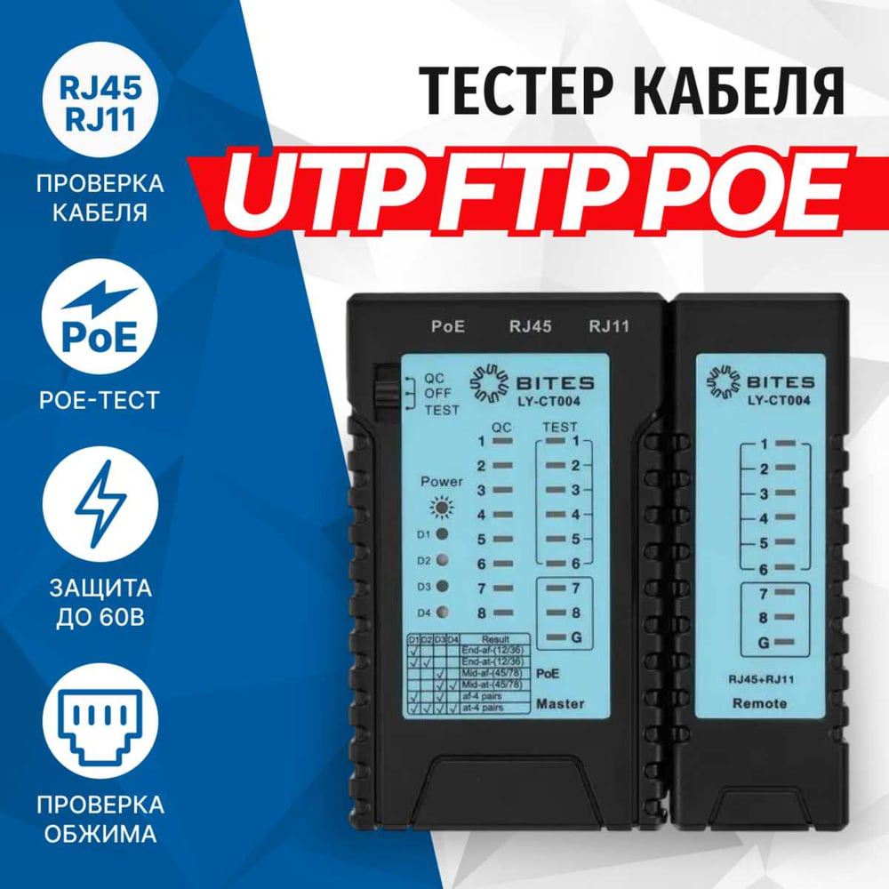 Многофункциональный кабельный тестер 5BITES LY-CT004 объединяет в себе различные режимы тестирования кабеля, в том числе POE-тестирование и проверку качества обжатия RJ45/RJ11 коннекторов. Тестер может проверить состояние сетевых соединений, телефонных линий на такие сбои, как обрыв цепи, короткие замыкания, перекрестные соединения. Он так же может использоваться для проверки питания сетевого кабеля и данных питания, определять тип оборудования источника питания (Endspan или Midspan) в сети. Устройство выполнено из качественного противоударного материала. Данный тестер широко используется в коммерческой, бытовой и других областях. Внимание! Не используйте в активной цепи >60В постоянного тока, чтобы избежать выгорания устройства. Технические характеристики: Тип тестируемых кабелей: витая пара / телефонный Применение: обнаружение ошибок в схеме разводки, замыканий, обрывов, кросс-соединений, проверка заземления экранированного кабеля Макс. расстояние действия (м): 2000 Тип индикации: светодиодная Проверка обжатия коннекторов: RJ45/RJ11 (QC-режим) Идентификация PoE оборудования: midspan/endspan Идентификация источника PoE питания: 802.3af/at Защита по напряжению (В): 60 Разъемы: RJ-45, RJ-11, POE Индикация низкого заряда батареи: есть Материал корпуса: противодуарный пластик Источник питания: батарея 9В «Крона» (в комплект не входит) Потребление (мА): 25 Габаритные размеры (мм): 104x62x27 (передатчик), 104х33х27 (приемник)