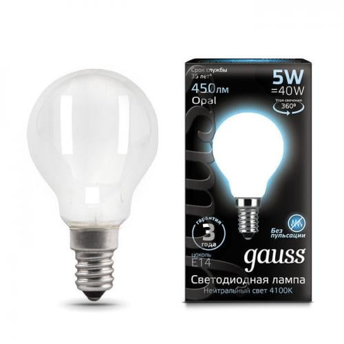 Светодиодные лампы Gauss за счет формы шара отличаются экономичностью и универсальностью. На потребляемые 5Вт светодиоды дают яркий свет с интенсивностью в 470Лм, чтобы стать экономичной заменой лампам накаливания. Шары на основе светодиодов дарят отличное рассеивание света, не греются, потому подходят для светильников любого типа с цоколем Е14. Белый нейтральный свет с цветовой температурой 4100К подходит для жилых комнат с повышенной активностью, офисов, магазинов. Лампа с ресурсом на 35 тыс.