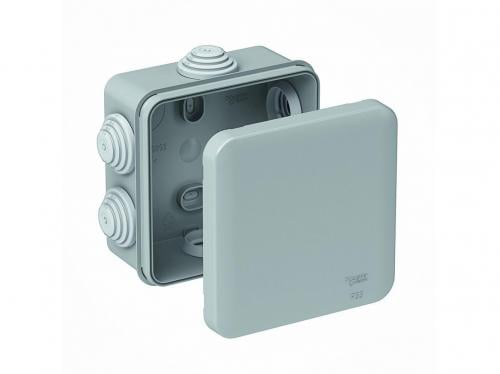 Распределительная коробка открытой установки, круглая. Коробка с защелкивающейся крышкой. С четырьмя небольшими ступенчатыми сальниками для ввода кабелей и гофротруб.